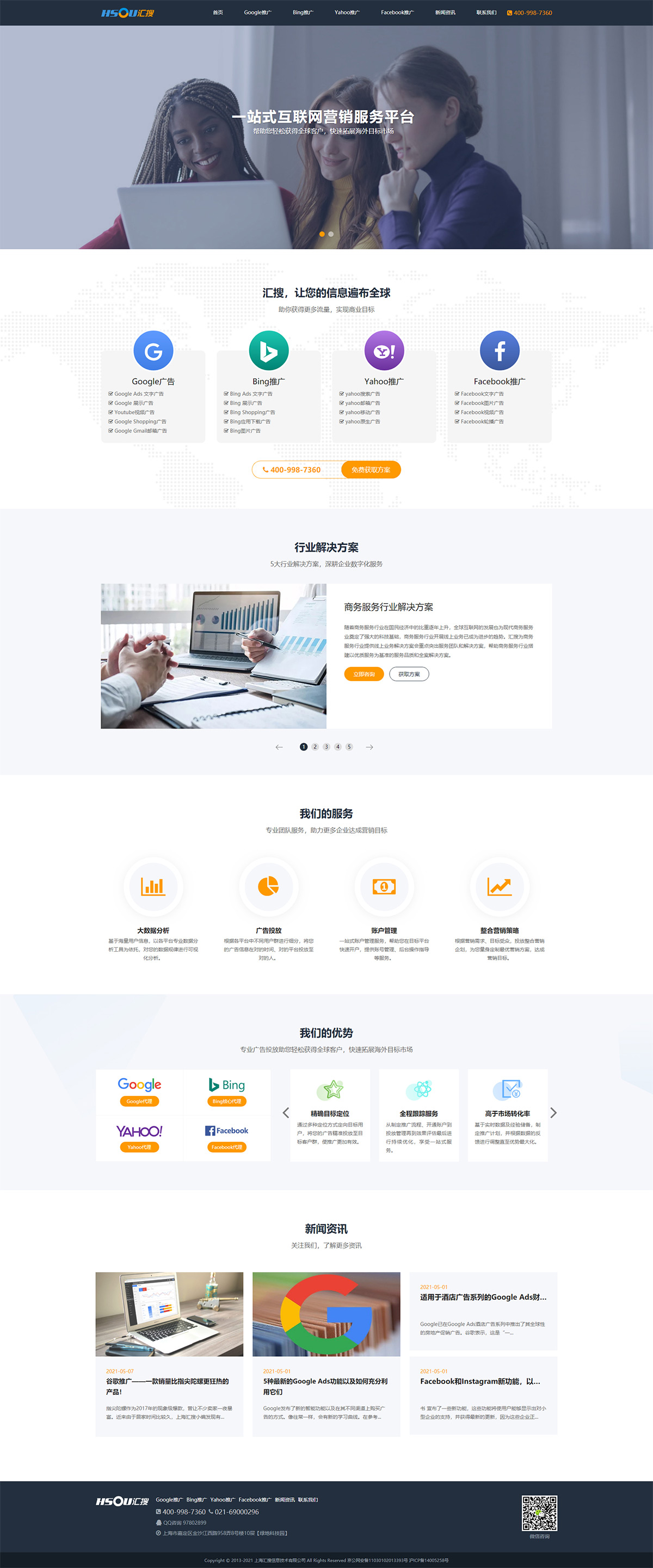 上海匯搜信息技術(shù)有限公司是一家專業(yè)的互聯(lián)網(wǎng)運(yùn)營(yíng)服務(wù)公司,為企業(yè)提供外貿(mào)整合營(yíng)銷服務(wù),包括:谷歌關(guān)鍵字廣告Google Ads、微軟必應(yīng)關(guān)鍵字廣告Bing Ads、以及谷歌SEO優(yōu)化等。專注于搜索營(yíng)銷并為客戶提供從域名、服務(wù)器的選擇,到多語(yǔ)言PC、手機(jī)端網(wǎng)站的建設(shè),以及多語(yǔ)言、多平臺(tái)的搜索營(yíng)銷服務(wù)。為客戶解決線上營(yíng)銷困境。