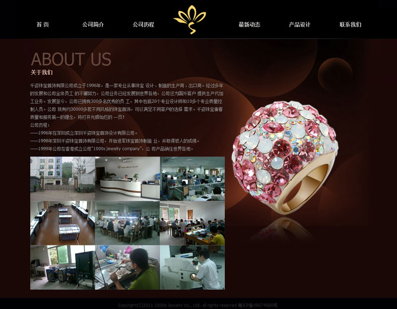 千姿珠寶首飾有限公司成立于1996年,是一家專業(yè)從事珠寶 設計、制造的生產商、出口商。經過多年的發(fā)展和公司全體員工 的不懈努力,公司業(yè)務已經發(fā)展到世界各地,公司還為國外客戶 提供生產代加工業(yè)務。發(fā)展至今,公司已擁有300多名優(yōu)秀的員 工,其中包括20個專業(yè)設計師和10多個專業(yè)質量控制人員。公司現(xiàn)有約30000多款不同風格的珠寶首飾,可以滿足不同客戶的選擇 需求。千姿珠寶秉著質量和服務第一的理念,將打開光輝燦爛的一頁!